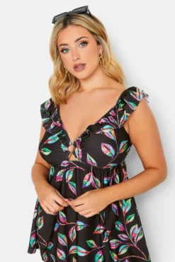 YOURS Curve Black Leaf Print Angel Sleeve Tummy Control Swim Dress