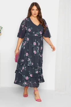 YOURS LONDON Curve Navy Blue & Pink Floral Mesh Panel Skater Dress