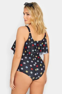 YOURS Curve Black Daisy Print Frill Chain Tummy Control Swimsuit