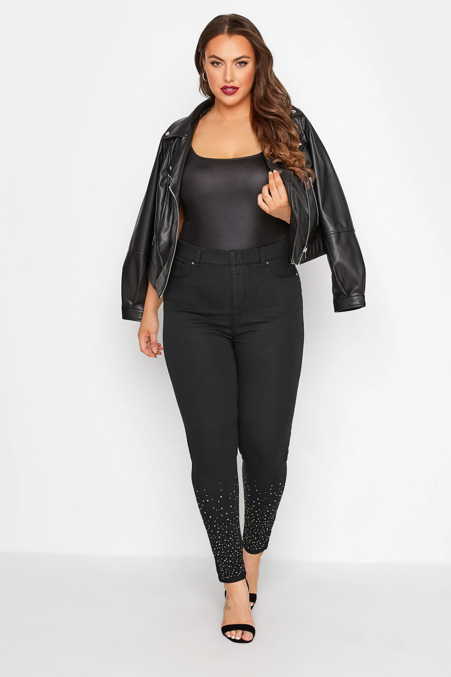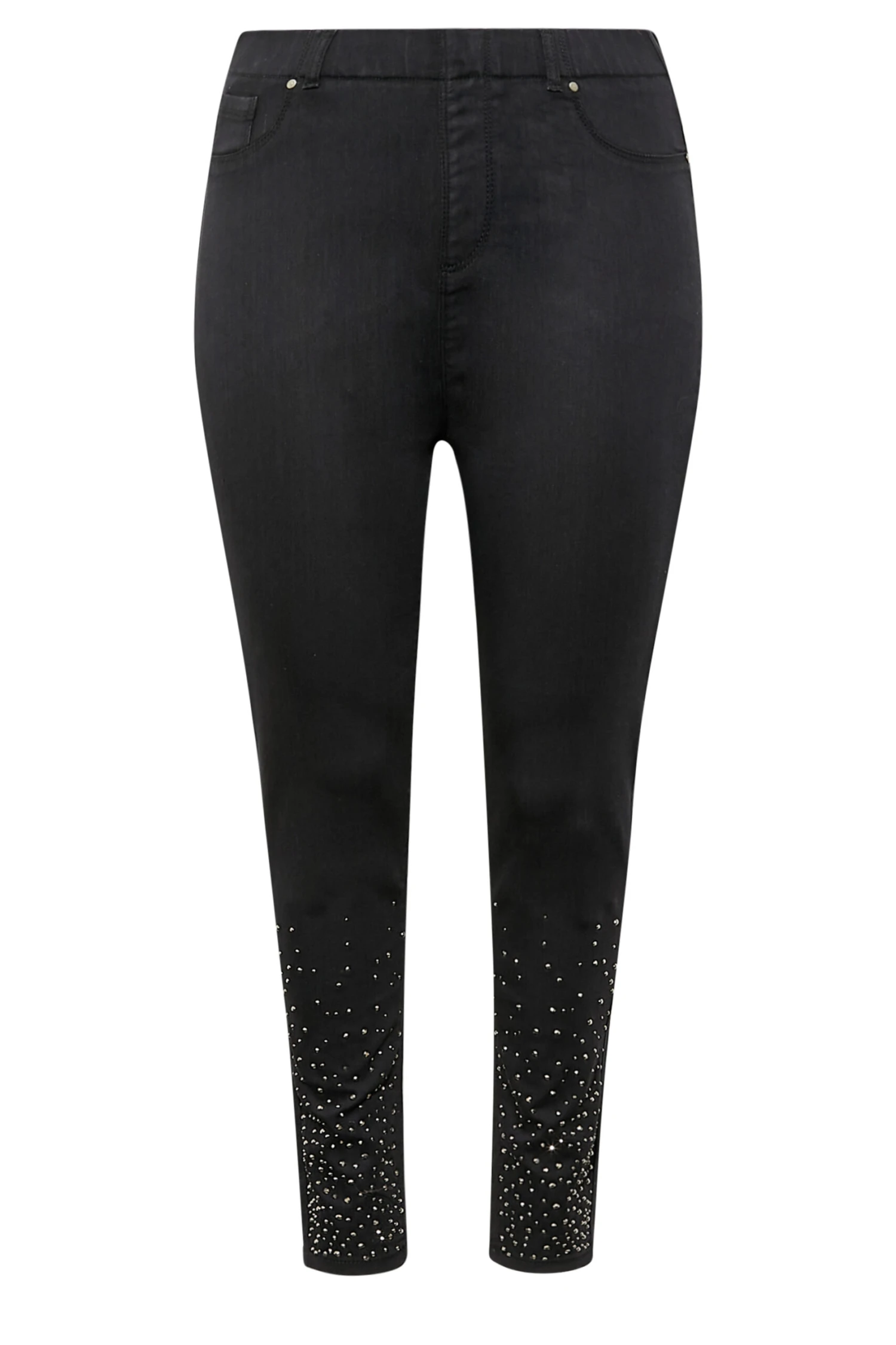 An elevated favourite, these embellished Jenny jeggings are a must-have! Comfortable in stretch denim and with an elasticated high waist, these plus size jeggings are finished with diamante embellished hems. Style with a nice top and heels to complete the perfect night out look.