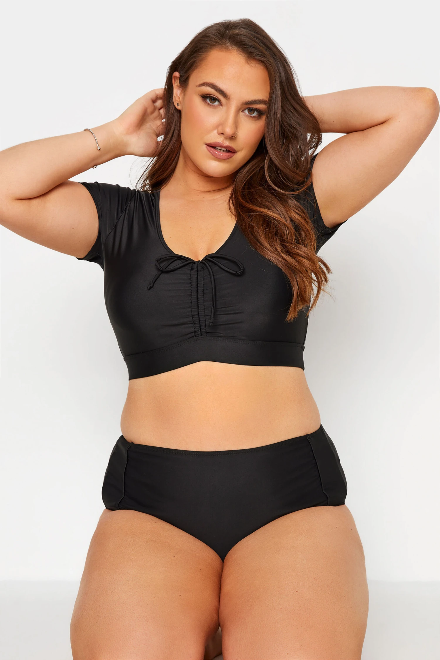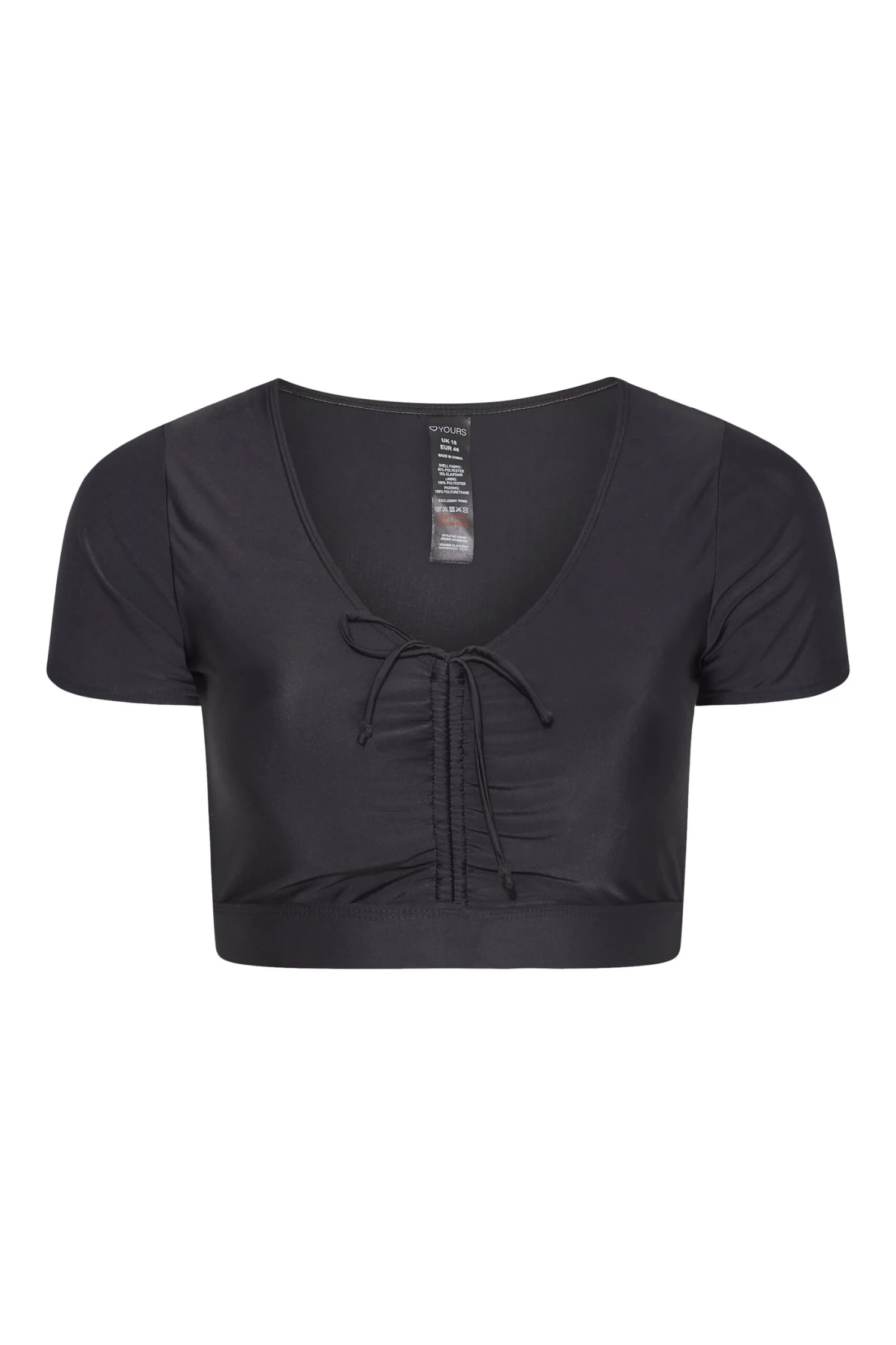 A swimwear staple. This bikini crop top is made in a stretch fabric and features an adjustable ruched v-neckline and cap sleeves for the perfect balance of coverage and style. Pair with matching bottoms for a look you can wear with confidence.
