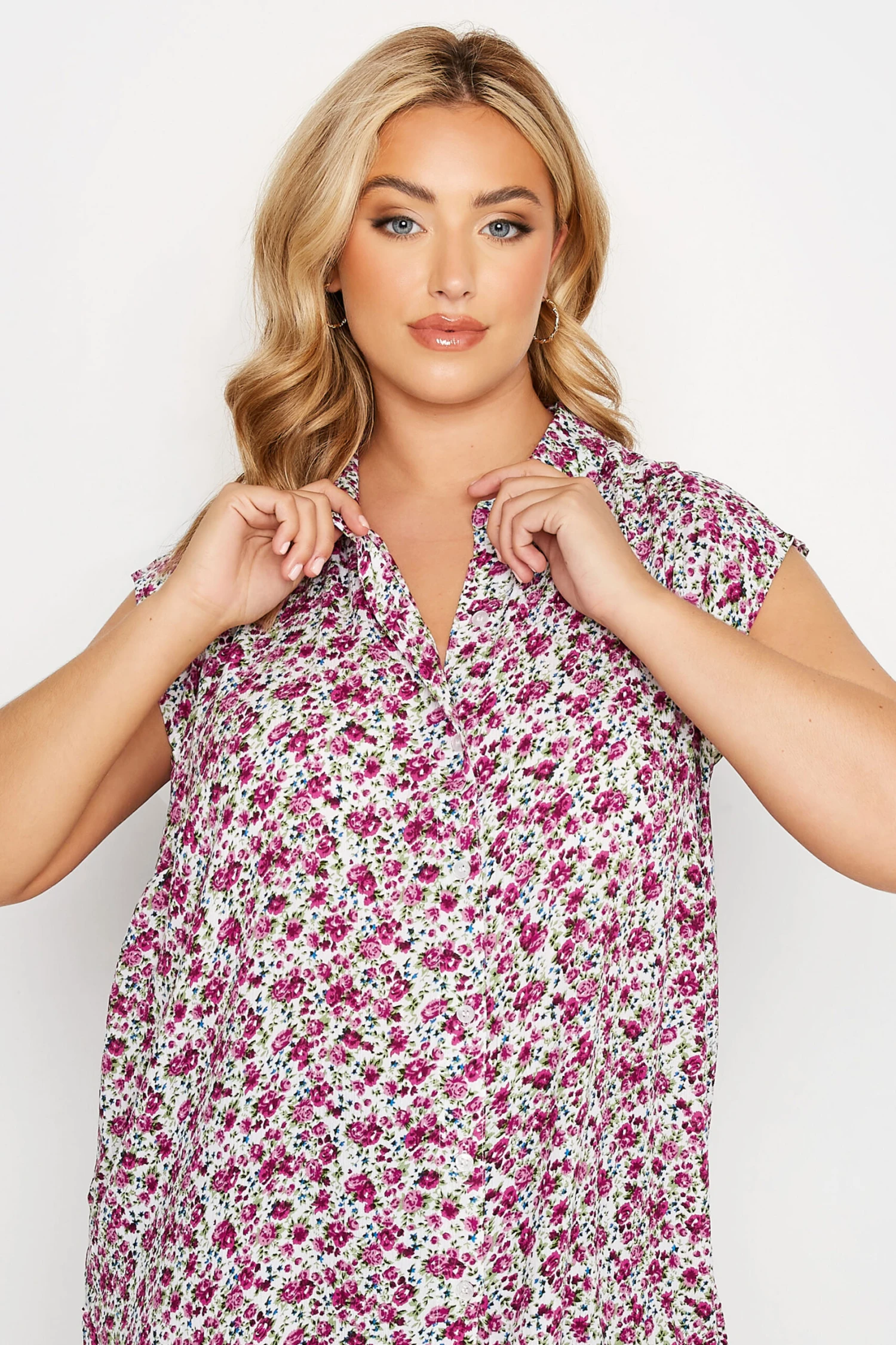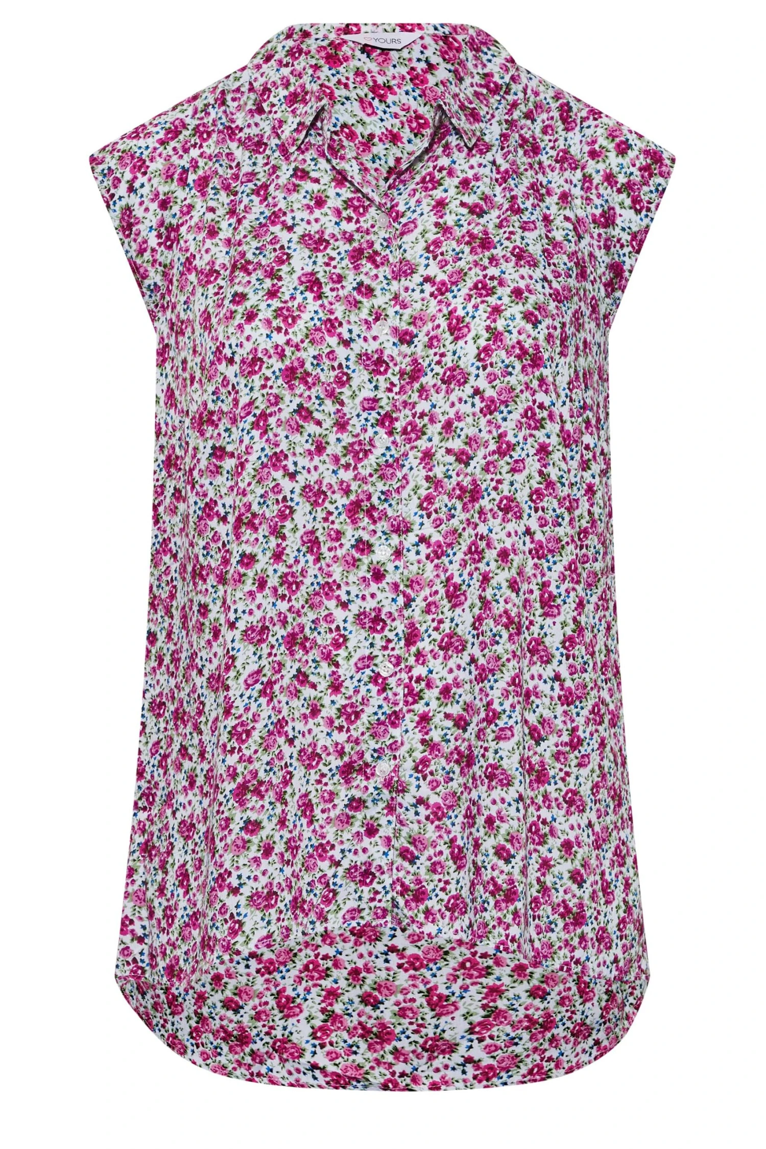 A versatile piece your wardrobe can’t live without! This plus size shirt features a dipped hem and short cap sleeves with a classic collar and button through fastenings, finished in a ditsy print. Wear with trousers and loafers for everyday wear, or opt for heels in the evening.